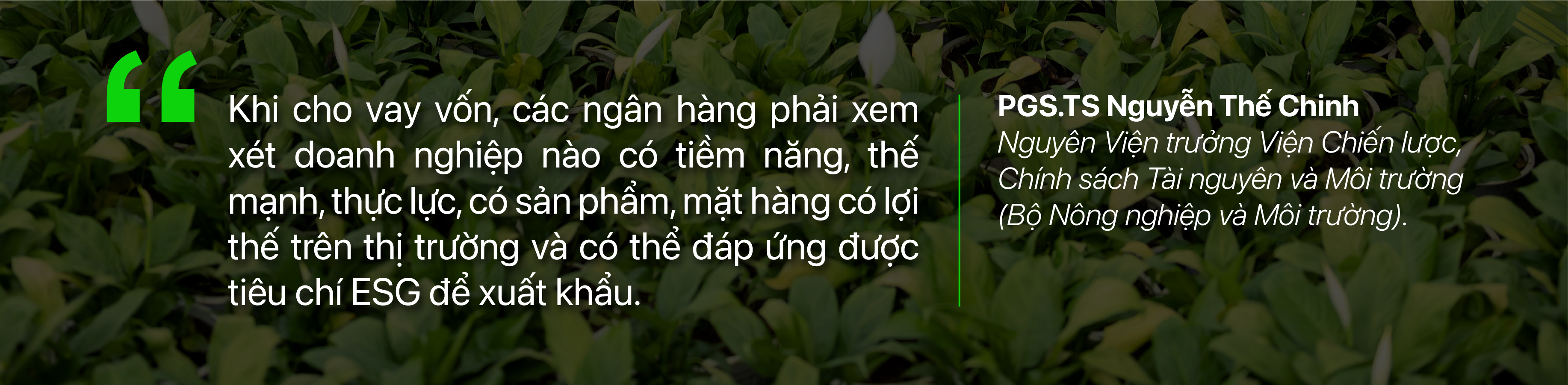 PGS.TS Nguyễn Thế Chinh nói rằng, các ngân hàng có cơ hội và tiềm năng rất lớn từ việc thực hiện ESG. Đầu tiên họ cần áp dụng tiêu chí ESG ngay từ trong chính nội tại của mình song song với hoạt động cung cấp vốn. Cụ thể, các tổ chức tín dụng phát huy vai trò, trách nhiệm trong việc “xanh hóa” dòng vốn đầu tư và áp dụng các tiêu chí Môi trường - Xã hội - Quản trị (ESG) góp phần thực hiện mục tiêu phát triển bền vững. Việc áp dụng ESG đòi hỏi các tổ chức tín dụng phải thực thi, tuân thủ và cập nhật liên tục những thay đổi trong quy định và chính sách để thể hiện tốt trách nhiệm với môi trường và xã hội. Việc thực hành các tiêu chuẩn ESG sẽ giúp nâng cao uy tín, thương hiệu của ngân hàng, tiếp nhận các dòng vốn đầu tư, hỗ trợ kỹ thuật từ các tổ chức tài chính quốc tế, phát triển các sản phẩm tín dụng..