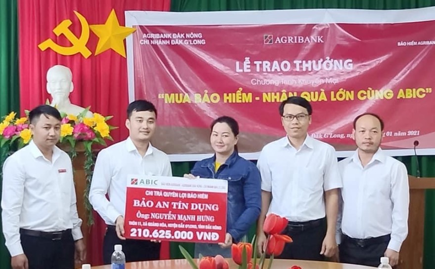 Cùng ngày, Agribank chi nhánh Đắk Glong - Đắk Nông cũng đã phối hợp cùng với Abic Đăk Lăk tổ chức chi trả bồi thường cho khách hàng Nguyễn Mạnh Hưng tại Thôn 11, xã Quảng Hòa, huyện Đắk Glong, tỉnh Đắk Nông với số tiền hơn 210 triệu đồng. Trước đó, khách hàng đã vay vốn tại Agribank Đắk Glong và tham gia bảo hiểm Bảo an tín dụng nhưng không may gặp rủi ro bệnh hiểm nghèo qua đời, số tiền trên đã giúp cho người thân giảm bớt gánh nặng nợ nần và tránh bị thanh lý tài sản khi không trả được nợ vay.
