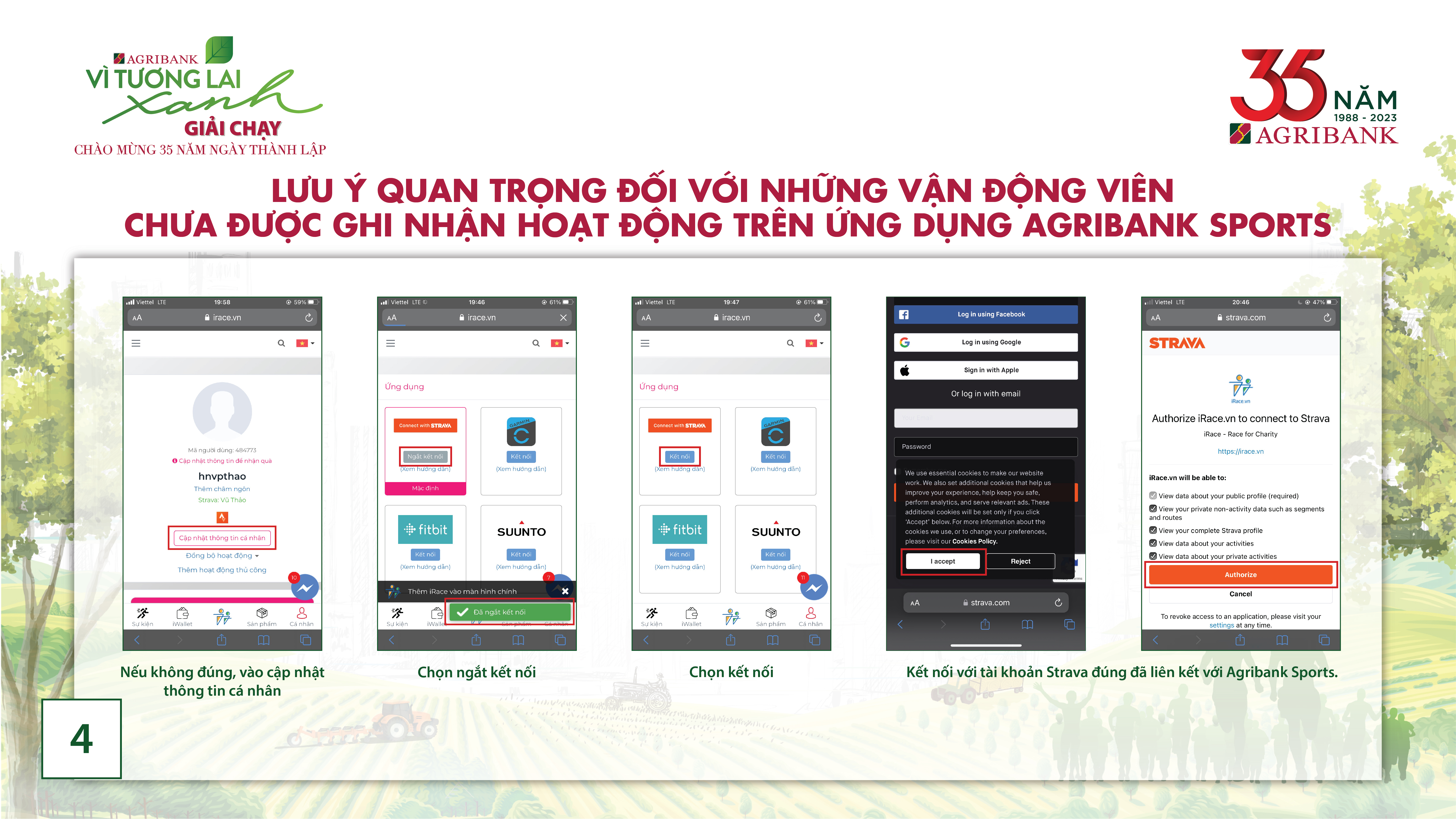 Theo đó, để được cập nhật thành tích của mình trên các bảng xếp hạng của Agribank Sports, bên cạnh các bước xác minh tài khoản Tài khoản Strava ghi nhận hoạt động là tài khoản đã được liên kết với ứng dụng Agribank Sports (theo hướng dẫn tại post: https://www.facebook.com/110199068661292/posts/121620217519177/), bạn cần làm theo các bước kiểm tra tài khoản đăng ký trên iRace.vn và tài khoản Strava liên kết trên iRace.vn.