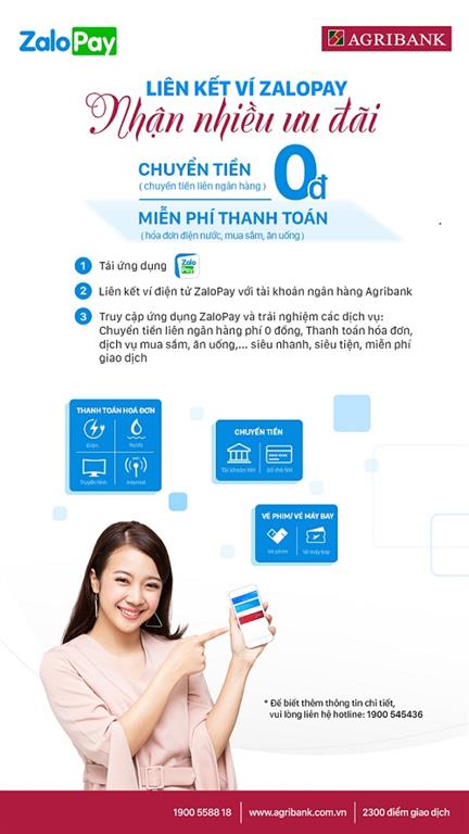 Để liên kết và trải nghiệm các dịch vụ tiện ích nói trên, khách hàng đến bất kỳ Chi nhánh/Phòng giao dịch Agribank trên toàn quốc để được nhân viên hướng dẫn, thực hiện liên kết ngay với ZaloPay. Chỉ một lần liên kết duy nhất, chủ tài khoản Agribank có thể nạp tiền miễn phí vào ZaloPay để thanh toán cho hàng trăm dịch vụ tiện ích, chi tiêu và tận hưởng nhiều ưu đãi chỉ có trên ZaloPay.