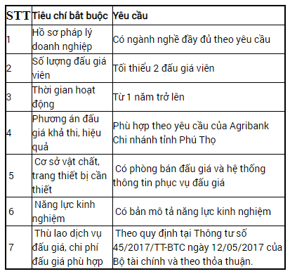Mọi tổ chức đấu giá phải có đầy đủ tiêu chí theo quy định tại khoản 4, Điều 56 Luật đấu giá tài sản ngày 17/11/2016 và tiêu chí cụ thể khác do Agribank Chi nhánh tỉnh quy định, cụ thể: