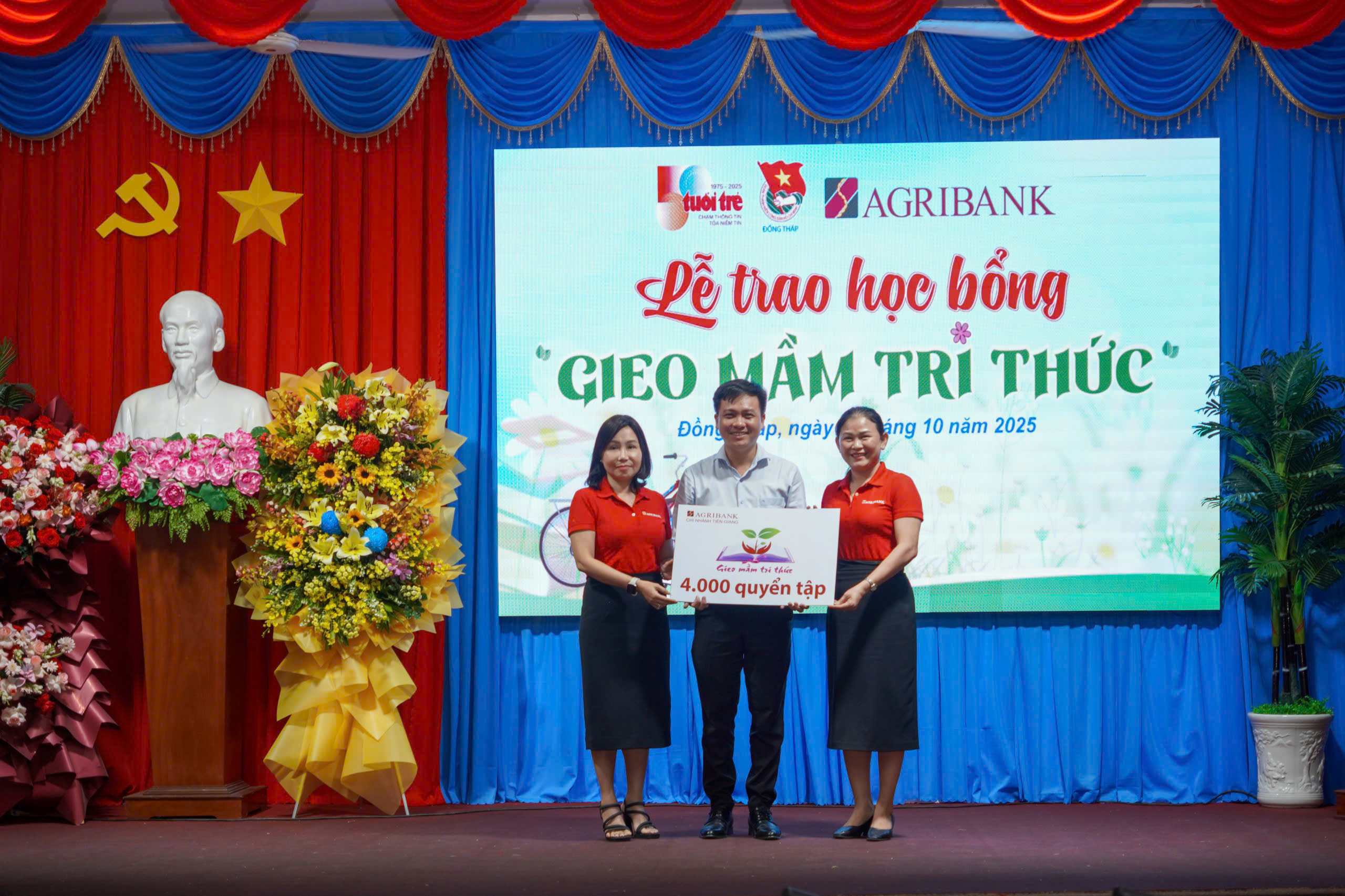 Chương trình trao học bổng “Gieo mầm tri thức” do Báo Tuổi Trẻ phối hợp với Agribank Chi nhánh Phú Nhuận (TP. Hồ Chí Minh) triển khai từ năm 2018. Qua 8 năm thực hiện, chương trình đã trao hơn 5.365 suất học bổng và quà cho học sinh nghèo, tổng trị giá gần 10 tỷ đồng. Riêng năm 2025, Agribank Chi nhánh Phú Nhuận dành 1,6 tỷ đồng, trao 800 suất học bổng cho các em học sinh nghèo vượt khó học tốt tại 4 tỉnh: Đồng Tháp, Vĩnh Long, Tây Ninh và Thanh Hóa.
