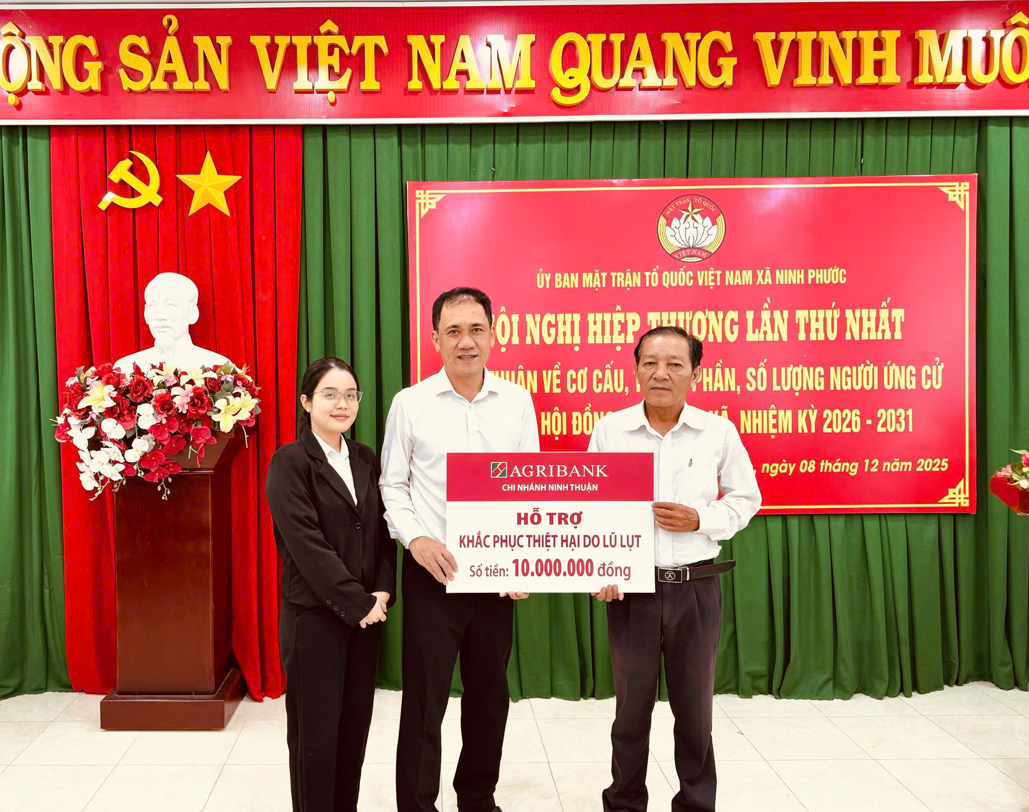 Đại diện Agribank Chi nhánh Ninh Thuận trao tiền hỗ trợ địa phương khắc phục thiệt hại do mưa lũ gây ngập úng nghiêm trọng