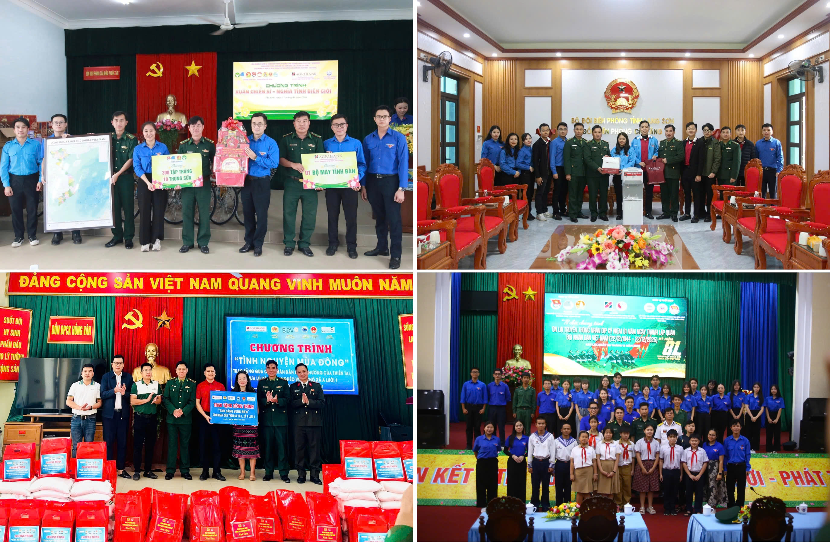 Tại mảnh đất địa đầu Lạng Sơn, tuổi trẻ Agribank đã có những hoạt động thiết thực chào mừng ngày thành lập Quân đội Nhân dân Việt Nam. Không quản ngại khó khăn, các đoàn viên đã phối hợp cùng Bộ Chỉ huy Quân sự tỉnh Lạng Sơn tham gia xây dựng nông thôn mới và thăm hỏi các gia đình chính sách. Những phần quà ý nghĩa đã được trao tận tay các thương binh tại phường Đông Kinh và quân nhân có hoàn cảnh khó khăn tại huyện Bắc Sơn.