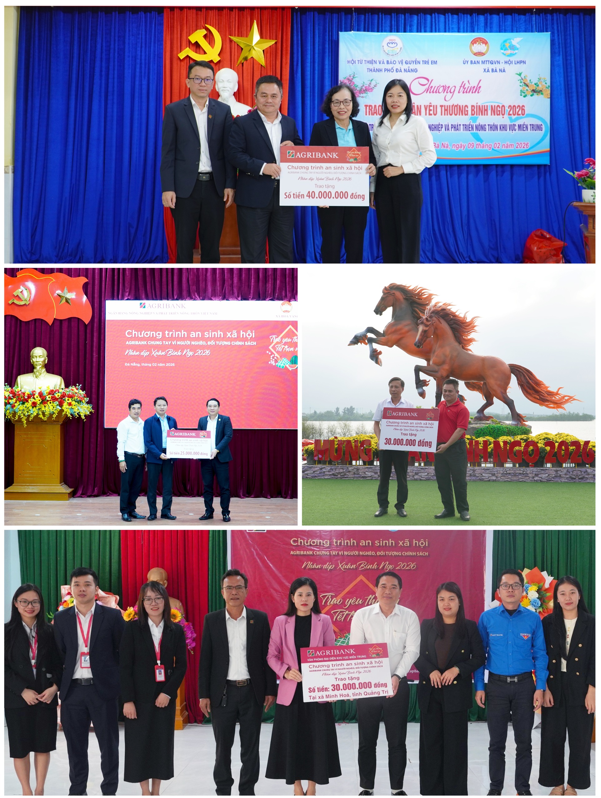 Tại thành phố Đà Nẵng và tỉnh Quảng Trị, VPMT cùng các đơn vị Agribank trên địa bàn đã trao 470 suất quà, mỗi suất trị giá 500.000 đồng, tổng kinh phí 310 triệu đồng; đồng thời phối hợp cùng VOV miền Trung trao 4,5 tấn gạo tại hai xã Hùng Sơn và A Vương, tổng kinh phí 75 triệu đồng; triển khai trao 120 suất quà Tết, tổng kinh phí 60 triệu đồng tại các xã thuộc tỉnh Quảng Trị. Các phần quà được trao đúng đối tượng, kịp thời, góp phần chia sẻ khó khăn, động viên các gia đình vươn lên trong cuộc sống, đón Tết cổ truyền của dân tộc trong không khí ấm áp, nghĩa tình.