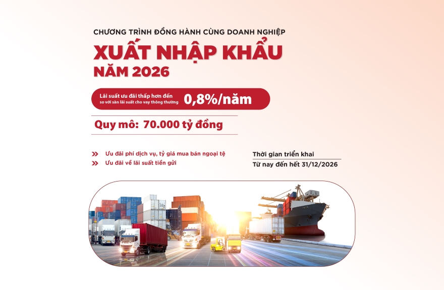 Đồng hành, thúc đẩy hoạt động xuất nhập khẩu, Agribank triển khai Chương trình đồng hành cùng doanh nghiệp xuất nhập khẩu năm 2026 với quy mô 70.000 tỷ đồng, ưu đãi tín dụng ngắn hạn bằng VND, lãi suất thấp hơn sàn lãi suất cho vay thông thường đến 0,8%/năm cùng nhiều ưu đãi về tiền gửi, phí dịch vụ và tỷ giá mua bán ngoại tệ.